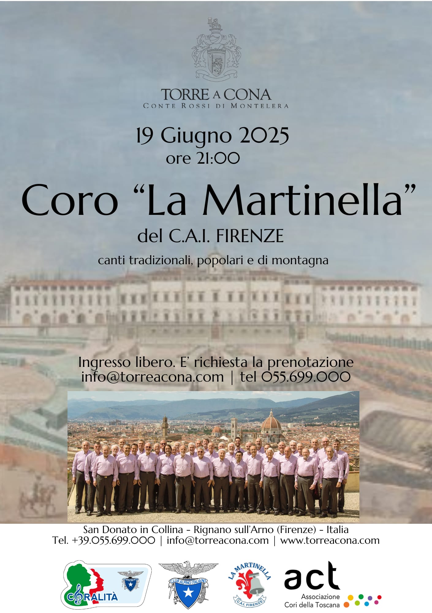 Concerto a Spasso per Firenze 26-6-20256 Giugno 2025GEEO – Valle e crinale del Sestaione – 22 giugno 202512 Giugno 2025 6 Giugno 2025 San Donato in Collina – Torre a Cona Giovedì 19 GIUGNO 2025 ORE 21 Ingresso libero. È richiesta la prenotazione: info@torreacona.com – tel. 055 699 000 Qui la locandina Condividi Articoli correlati1 Aprile 2026Cori in Amicizia – 10 e 11 aprile 2026Leggi di più22 Settembre 202545^ Rassegna Corale 27-09-2025Leggi di più6 Giugno 2025Concerto a Spasso per Firenze 26-6-2025Leggi di più